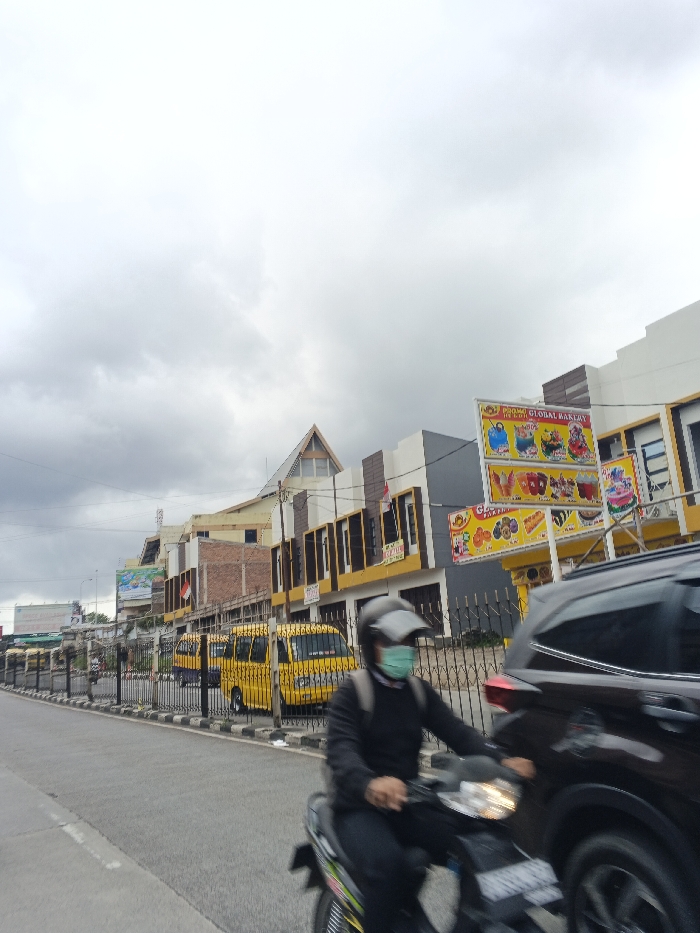 The image captures a street scene in Palayan City, Philippines, under an overcast sky with dark grey clouds. In the foreground, a person wearing a black long-sleeved shirt, dark pants, a grey full-face helmet with the visor raised, and a light blue surgical mask is operating a dark-colored motorcycle. A dark backpack is visible on the rider's back. The motorcycle's headlight is illuminated, and motion blur suggests forward movement. A dark-colored SUV is partially visible to the right of the motorcycle, also appearing to be in motion. The right side of the street is bordered by a black metal fence, behind which are multiple multi-story commercial buildings. These structures display facades in white, grey, brown, and yellow. One building features a distinctive gabled roofline. Red and white banners are visible on the exterior of several buildings. A prominent yellow sign for "GLOBAL BAKERY" is displayed, showcasing images of cakes, ice cream, and other baked goods. Below it, a smaller yellow sign presents various snack items. Several yellow vans or utility vehicles are parked or stationary behind the fence. The asphalt road surface includes a white solid line on its left edge. Utility poles, electrical wires, and distant billboards are visible on the left side of the frame.