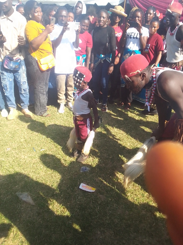 This image captures an outdoor cultural gathering in Jos, Nigeria, under natural daylight casting distinct shadows on a grassy field. **Environment:** The scene unfolds on a well-maintained patch of green grass. Direct sunlight from the left illuminates the subjects, casting elongated shadows towards the right. Several pieces of litter, including clear plastic bags and a white-orange "AZAN" brand snack wrapper, are visible on the ground. In the background, a white tent or canopy provides partial shade for a crowd of observers. **People:** Approximately 15-20 individuals are visible, primarily spectators, focused on two central figures. * **Central Figures:** * A young, dark-skinned child stands in the foreground, facing slightly left. The child wears a white tank top, maroon trousers with white side stripes, and dark shoes. A red cap adorned with white circular decorations covers the head, complemented by a red beaded necklace. White, furry, plume-like adornments are attached to the outer sides of the child's lower legs. * To the child's right, partially obscured by an orange blur in the bottom right, is a dark-skinned adult male, bending forward. He wears a red cap, similar to the child's, and multiple white beaded necklaces around his neck. White, furry adornments are also visible near his legs, consistent with the child's attire. * **Spectators:** A dense crowd of adults and possibly adolescents stands behind the central figures, observing the activity. They are dressed in various casual attire, including t-shirts (one with "HELLO" visible), jeans, and traditionally patterned wraps around the waist. Several individuals in the crowd are holding smartphones horizontally, actively recording or photographing the event. **Actions/Interactions:** The central child and adult appear to be participating in a performance or ritual, distinguished by their traditional-style garments. The adult is bent forward, engaging with something out of frame or the ground, while the child stands attentively. The surrounding spectators are engaged, with many documenting the scene using mobile devices. **Objects:** Prominent objects include smartphones used by spectators, the distinctive red caps, beaded necklaces, and furry leg adornments of the central figures, and the aforementioned litter on the ground. A yellow shoulder bag is visible on one female spectator. The orange blur in the bottom right partially obscures the scene.