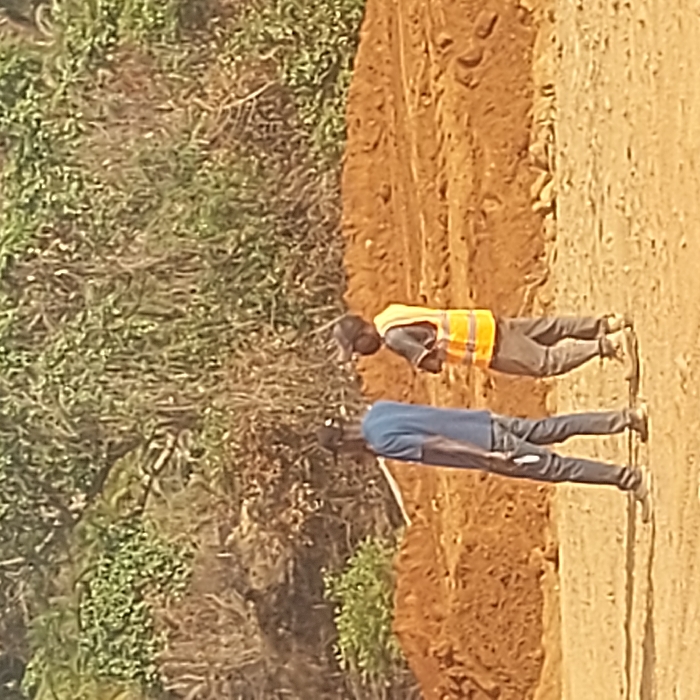 Two men stand on a dirt road