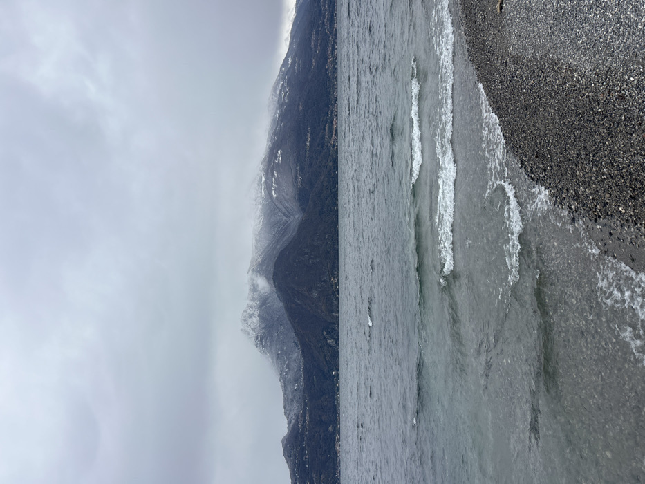The scene depicted does not correspond to the city of Bologna, Italy. Instead, the image presents a wide, overcast landscape featuring a large lake and snow-capped mountains under a uniformly grey sky. The upper third of the frame is dominated by a flat, grey, cloudy sky. Below this, across the mid-ground, are rugged, dark greyish-blue mountains. Their peaks and upper slopes are visibly covered with patches of white snow and obscured by mist or low-hanging clouds. Small, indistinct clusters of buildings or settlements are discernible along the lower mountain slopes and distant shoreline. The middle section of the image is occupied by the expansive, dark blue-grey water of the lake. The water's surface is choppy, with several lines of white-crested waves forming and breaking as they approach the foreground. The bottom right quadrant features a natural shoreline composed of dark grey and lighter-colored pebbles and stones. These stones are wet from the lapping lake water, which is clear enough in the shallows to reveal the submerged rocky bottom. No individuals or specific man-made objects are visible in the immediate foreground or mid-ground. The overall environment appears cold and overcast.