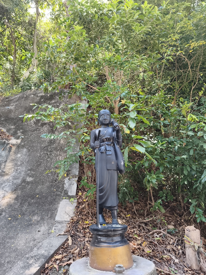 A black statue of a monk stands in a wooded area, holding a staff and a bag slung over his shoulder. It rests on a cylindrical base with a wider, flared top. The statue is positioned on a concrete platform amid a scattering of brown leaves. To the left, a textured gray wall rises, while lush green foliage fills the background, partially obscuring the statue. A weathered, carved post wrapped with yellow and white cord sits to the right.