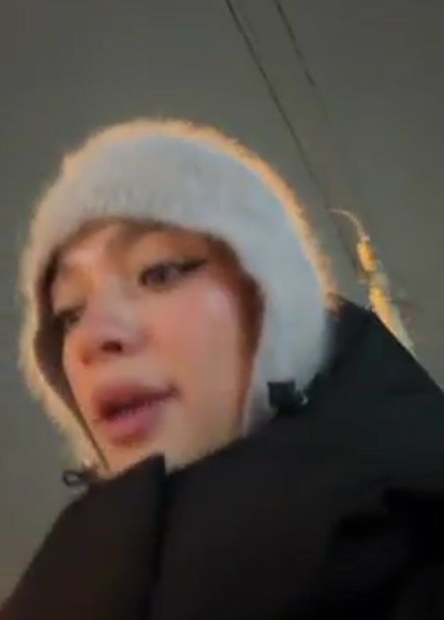 A person with light skin, wearing a white, fuzzy hat and a black coat, appears to be recording a video while outside at night