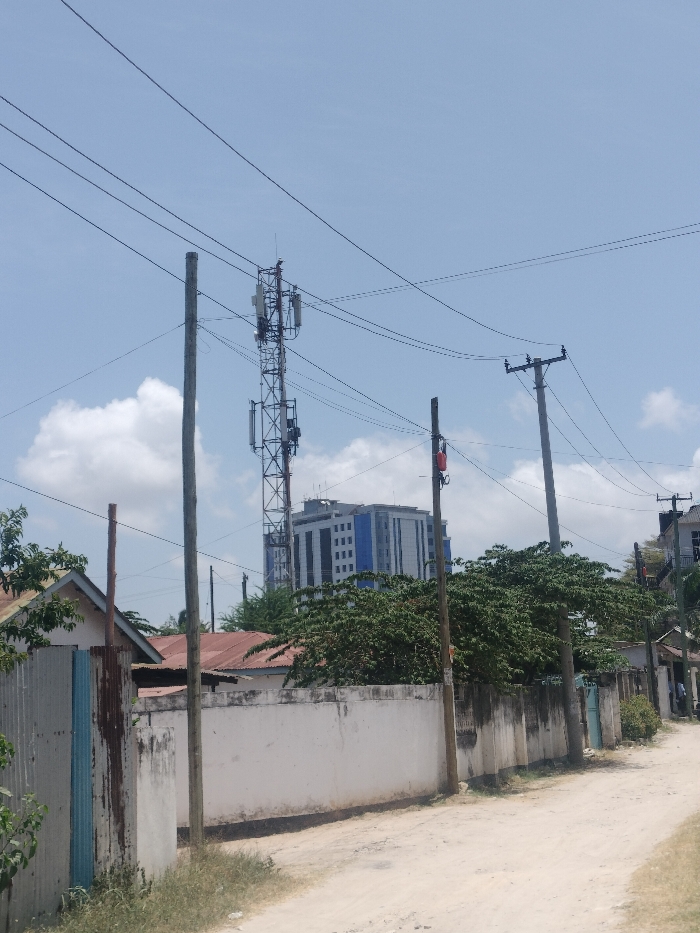 This image displays a street scene in Dar es-Salaam, Tanzania, under a bright, partly cloudy sky. The foreground features a light-colored dirt road, receding slightly to the right. To the immediate right of the road, a low, weathered concrete wall, exhibiting dark stains, extends horizontally. Behind this wall, dense green foliage and trees are present. To the left, a corrugated metal fence and the reddish-brown corrugated metal roofs of low-rise residential structures are partially visible. Multiple utility poles, constructed from both wood and concrete, rise throughout the scene, supporting a complex network of overhead power and communication lines. A red, cylindrical object is affixed to one wooden utility pole on the right. In the mid-ground, a tall, open-lattice cellular communications tower, equipped with multiple antenna arrays and equipment platforms, stands prominently. Behind the tower, a modern multi-story building with a light-colored facade and distinctive blue-paneled sections is visible. No individuals are distinctly identifiable within the frame.