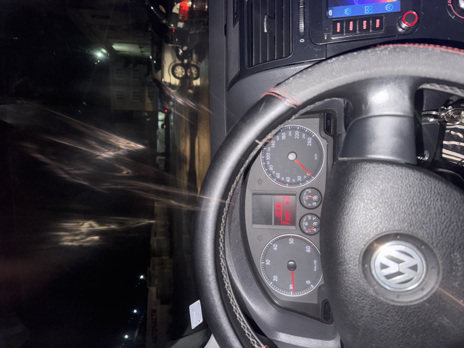 The image presents a view from inside a stationary vehicle at night in Kaspichan, Bulgaria. The foreground shows the car's interior, specifically a black Volkswagen steering wheel with red stitching. Behind the steering wheel, the instrument cluster displays a speedometer (0 km/h), a tachometer (0 RPM), and digital readouts indicating the time as "21:09" and an odometer value of "27889.3". To the right, a multi-media infotainment system with a blue display and control buttons is visible. A set of keys is hanging from the ignition, partially obscured by the steering wheel. Through the windshield, which exhibits light streaks and reflections, an outdoor scene is visible under artificial illumination. The ground appears wet, reflecting lights from the surroundings. In the middle ground, multiple parked cars are present, including a silver sedan and portions of a darker vehicle. In the background, a multi-story building is faintly discernible. To the left, a commercial building features the Cyrillic inscription "АВТОЧАСТИ" (Auto Parts). The environment appears to be an urban or semi-urban commercial zone during damp evening conditions.