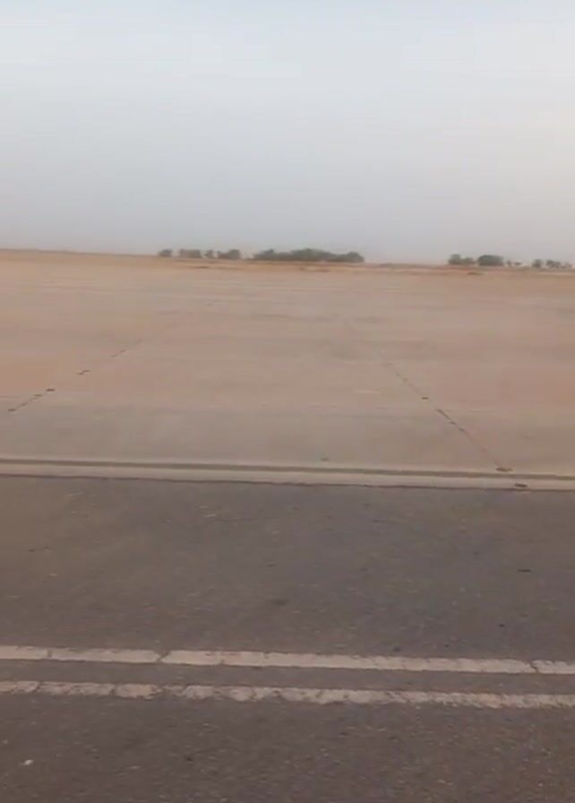 wide, paved runway. In the distance, a white airplane is landing. A group of people are standing on a road near the runway, watching the plane. The sky is overcast and hazy. The people are wearing a mix of casual and official attire. The overall environment seems open and possibly arid.