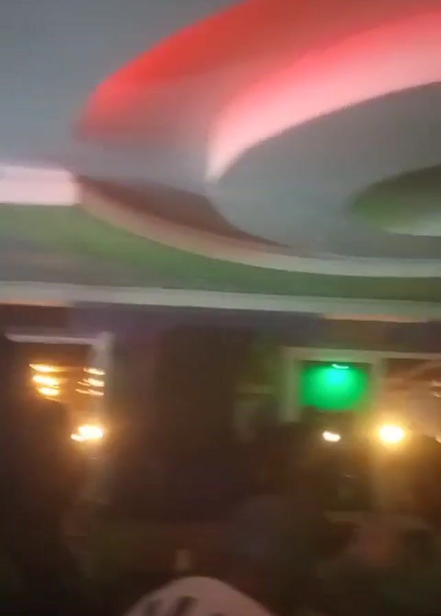 n indoor scene at what appears to be a nightclub or bar. The lighting is low and colorful, primarily red and green. Many people are present, though they are mostly seen from the back or in profile. The focus is often drawn to the elaborate ceiling design, which features curved elements lit with red and green lights. Music is playing loudly, which adds to the lively atmosphere of the scene.