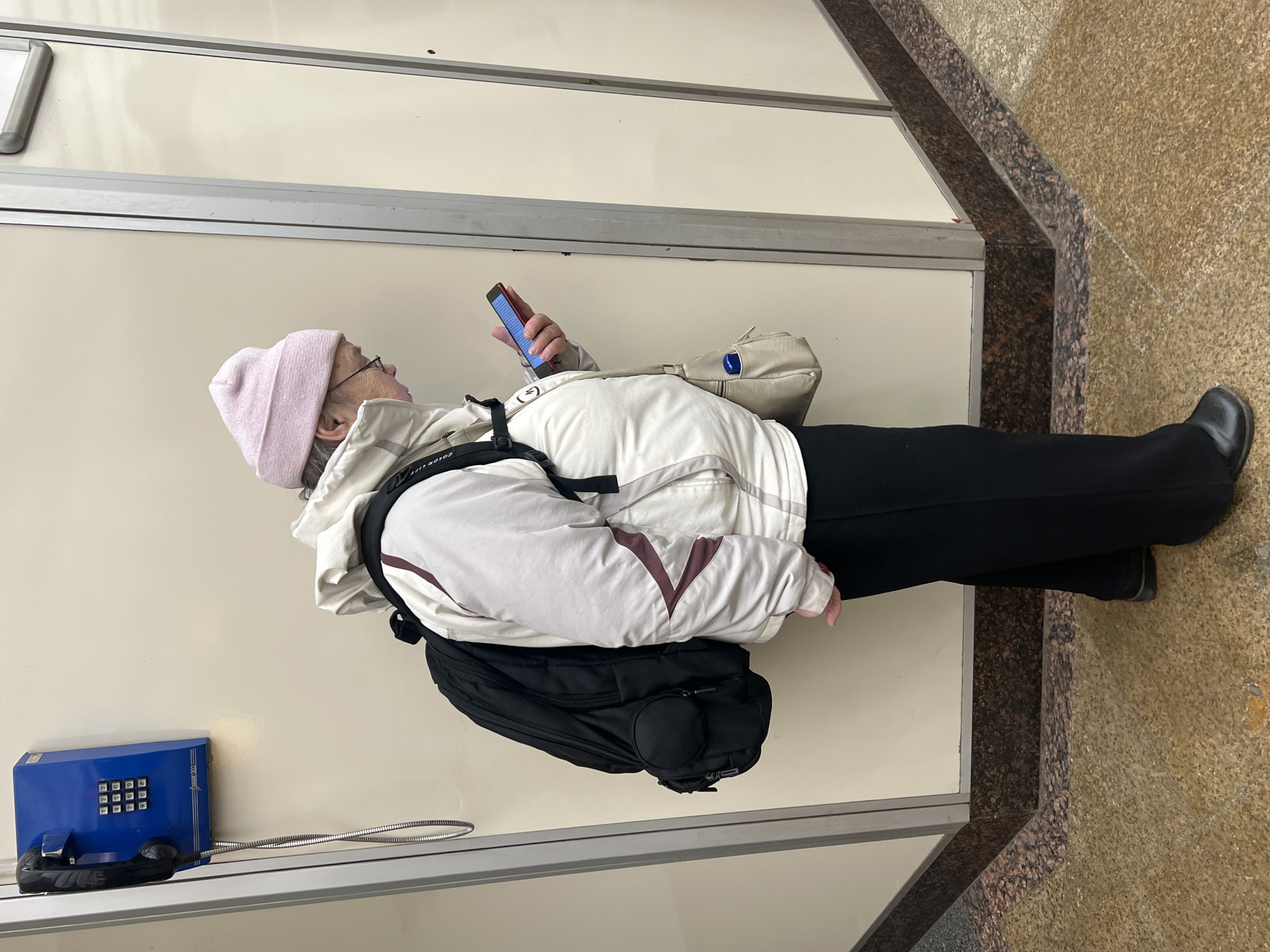 An older individual, wearing a pink knitted beanie, dark-framed glasses, an off-white puffer jacket with burgundy-colored diagonal stripe accents, dark wide-leg pants, and dark flat shoes, stands in profile facing right. A black backpack is worn on their back, and a light beige shoulder bag hangs from their left side, with a blue object visible inside an exterior pocket. The individual holds a red-cased smartphone with a lit blue screen in both hands, looking down at it. To the left, a blue wall-mounted payphone with a black handset and a numeric keypad is affixed to a light beige wall panel. The handset hangs from a coiled silver cord. The wall consists of light beige rectangular panels separated by metallic gray vertical dividers, forming an interior corner. The floor is tiled with a speckled light brown material, and a dark brown and pinkish-brown speckled granite border runs along the base of the wall. This scene takes place indoors, likely within a public building or transit station in Shushary, Russia.