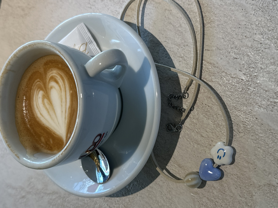 A close-up, elevated view captured in Polje, Montenegro, depicts a ceramic coffee cup and saucer resting on a light-colored, textured table surface. The white cup contains a beverage, likely a latte or cappuccino, featuring a distinct heart-shaped latte art design on its frothy surface. A portion of a red logo, "do life style," is visible on the cup's side. A small silver spoon is positioned on the saucer to the left of the cup, and a white sugar packet with gold text is behind the cup's handle. Below the cup and saucer, a light beige cord, appearing to be a necklace or bracelet, is laid out on the table. This cord is adorned with three ceramic beads: one striped beige-and-white spherical bead, one light blue heart-shaped bead, and one white cloud-shaped bead featuring a blue smiley face. The cord is equipped with a silver-colored lobster clasp and an extender chain. Strong directional light originates from the left, casting shadows from the cup and necklace onto the table. No individuals are present in the image.