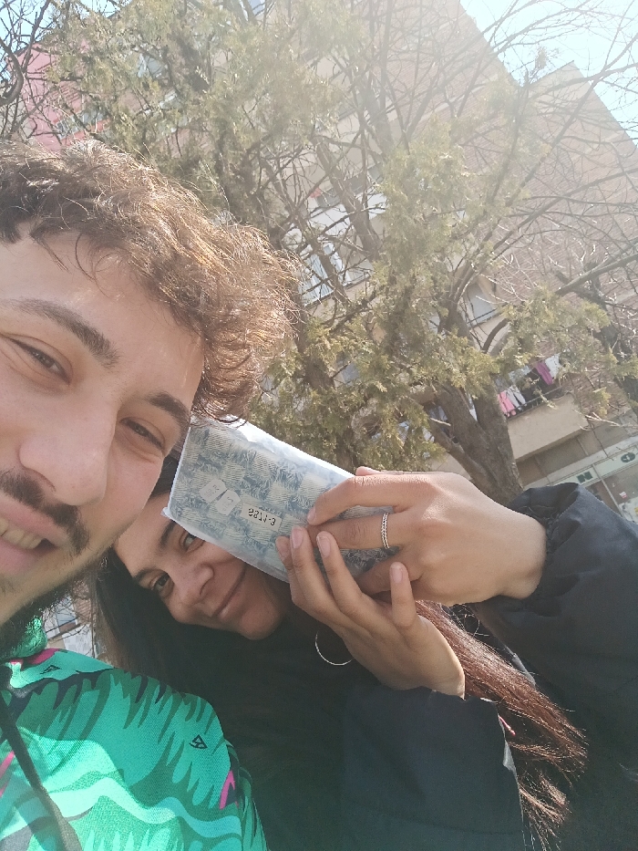The image presents two individuals in an outdoor, brightly lit urban setting within Mezdra, Bulgaria. In the immediate foreground, partially visible on the left, is a male subject with curly brown hair, a mustache, and a goatee, smiling towards the camera. He is wearing a teal-green patterned garment. To his right and slightly behind, a female subject is visible, also looking towards the camera with a subtle smile. She has long, dark hair and wears a dark jacket. Her left hand holds a rectangular object, likely a smartphone, encased in a clear protective cover. The cover contains an insert with a light blue and white checkered pattern and a white label bearing the reversed text "281-3". A silver-colored ring is present on her left ring finger. The background features several trees, some retaining sparse green foliage and others appearing deciduous with bare branches. Behind the trees, multi-story buildings, consistent with residential or commercial structures, are visible, one displaying laundry hanging from a balcony or window. The sky above is clear and blue, indicating a daytime scene.