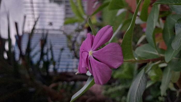 close-up of a single pink flower with five petals, blooming from a green plant