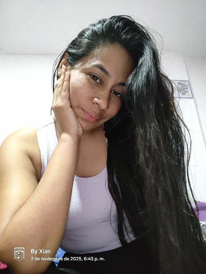 A close-up indoor shot depicts a single individual, a young adult female, positioned slightly off-center and looking directly at the camera. Her dark, long, wavy hair falls over her right shoulder. She has light-brown skin, dark eyes, and full lips, displaying a slight smile. Her left hand is placed against the left side of her face, with fingers resting on her jawline. She is wearing a light-colored, ribbed tank top, possibly lavender. A dark garment is partially visible at the bottom right. The background is a plain white wall, with a white ceiling visible in the upper left corner. On the wall, to the upper right of the individual's head, a small, framed image or drawing is affixed, featuring what appears to be a skull or stylized face with blue and red accents. The image bears a digital timestamp overlay: "By Xian" and "2 de noviembre de 2025, 6:43 p. m." The specific location within the city of Cali, Colombia, cannot be determined from the visual information provided.