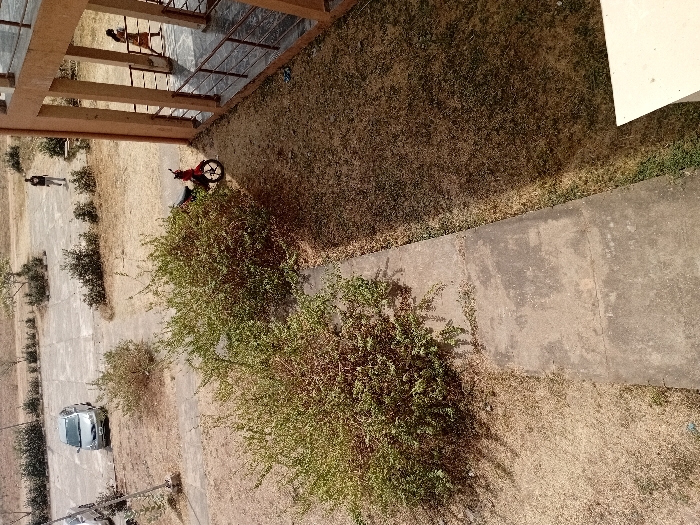 An aerial view captures a university building's exterior. The foreground showcases a concrete pathway lined with bushes and dry grass. A red motorcycle is parked nearby. Further away, a silver car sits on a paved area. In the background, two individuals are visible, one on a walkway of the building, and the other seemingly strolling. The overall scene suggests a quiet outdoor campus environment.