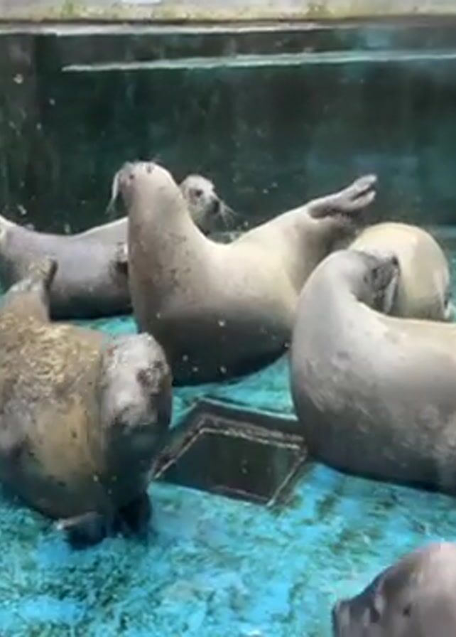 seven seals in an enclosure. The enclosure has a blue floor and a dark green wall. There is a small, square drain in the center of the floor. Some of the seals are lying down, while others are sitting up and looking around. One seal is lying on its back with its flippers in the air. Water is being sprayed into the enclosure. People can be seen outside the enclosure, watching the seals.