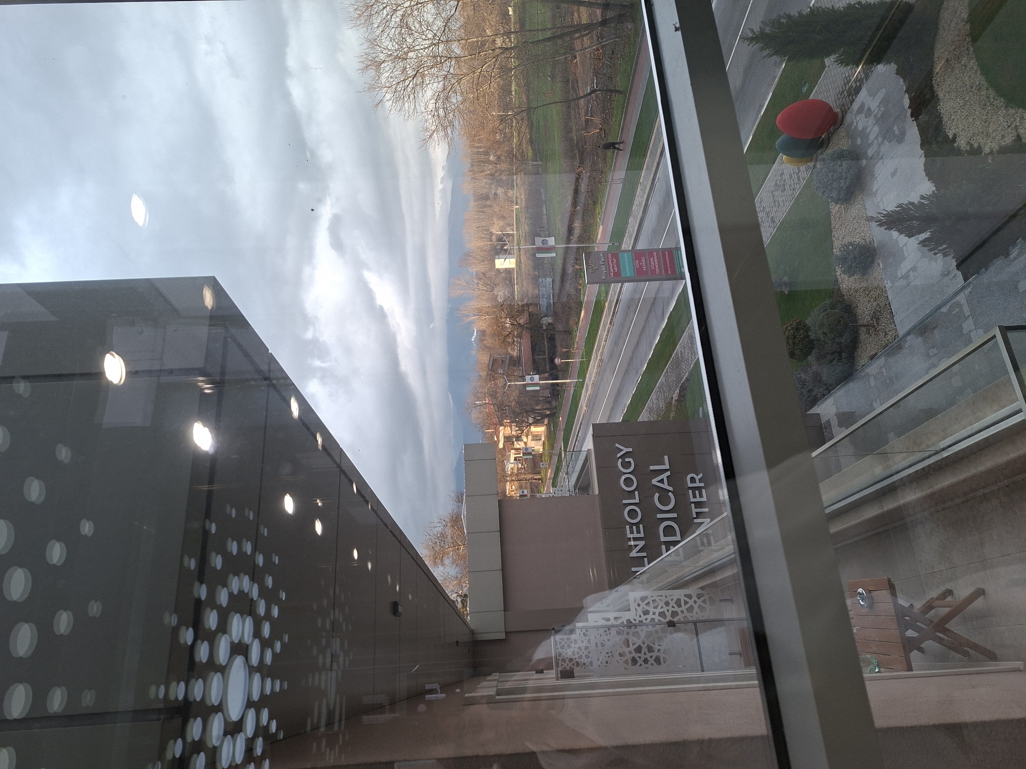 view from a window, seemingly inside a building looking outwards. The reflection in the glass includes parts of the interior, a building facade, and an exterior street scene. The outside scene includes a street with vehicles, pedestrian pathways, trees, and buildings. In the background, there are blurred mountains under a cloudy sky. Signage indicates the location is related to the "Balneology Medical Center." The reflections in the window indicate a modern building design, with what appears to be circular lighting. The wooden bench with a green bottle next to it is also reflected in the window.