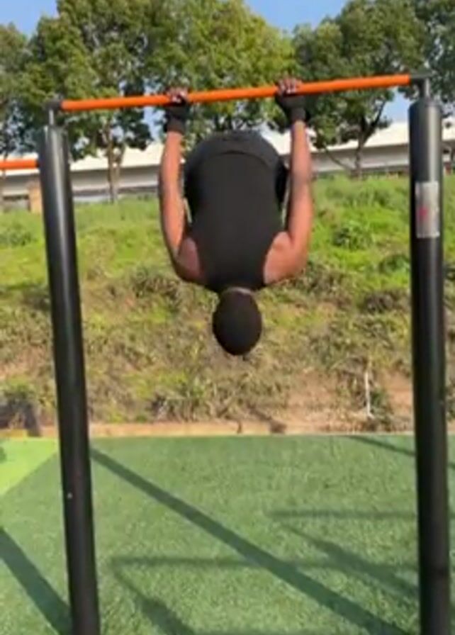 person performing gymnastic maneuvers on a metal pull-up bar in an outdoor park setting