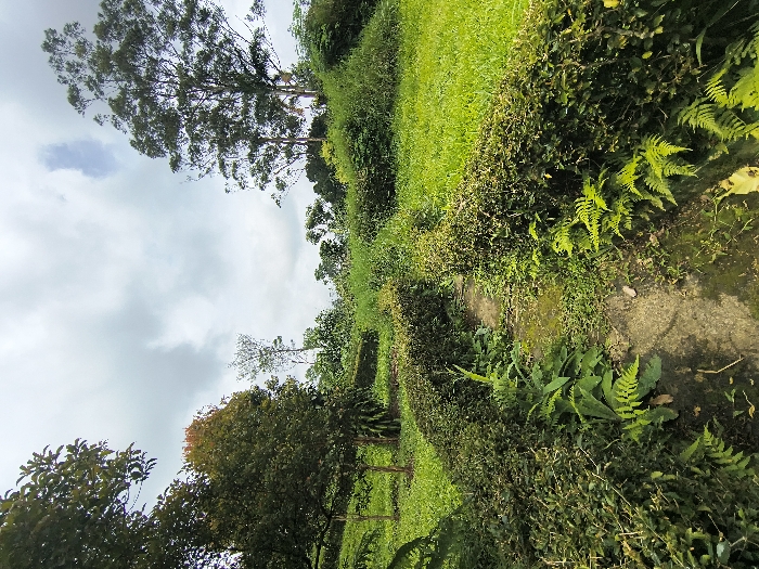 The landscape features lush greenery with diverse plant life. Tall trees stand against a cloudy sky, while shrubs and ferns line a pathway. The ground is covered in grass and moss, creating a vibrant, natural scene. The image is rotated slightly, adding a dynamic perspective to the overall composition.