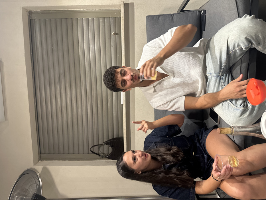 Two individuals, a female and a male, are seated on a gray outdoor-style cushioned bench in Givat Shmuel, Israel. The setting appears to be an indoor or semi-enclosed patio area. The female, with long dark hair, wears a dark denim short jumpsuit and holds a clear plastic cup containing a light amber liquid in her left hand. Her right hand is raised, index finger pointed upwards, as she looks towards the male. The male, with dark curly hair, wears a white textured polo shirt and light blue denim jeans; he is actively drinking from a similar clear plastic cup with light amber liquid. Between them on the cushion, a dark smartphone is visible. On a surface in the foreground, two clear glass bottles, one with a cork, and a red plastic lid are present. In the background, a light-colored wall features a window closed by a gray, slatted external rolling shutter. A dark brown or black woven shoulder bag hangs on a ledge below the shutter. To the far left, a silver, tall outdoor patio heater is partially visible.