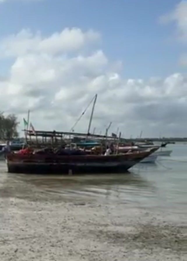 The camera shows a wide shot of several boats resting on the shore and in shallow water