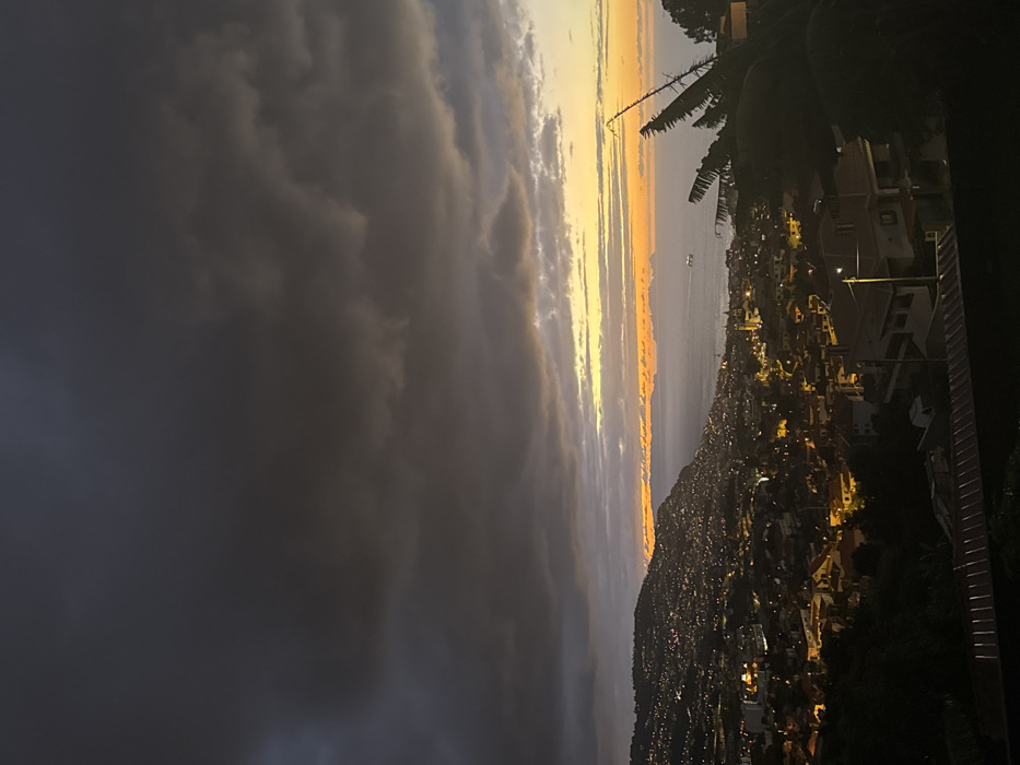 The image displays a panoramic view of the city of Funchal, Portugal, at dusk or shortly after sunset. The scene is observed from an elevated position, looking down over urbanized hillsides extending towards the Atlantic Ocean. The sky is largely covered by dark, heavy, and textured clouds, particularly in the upper half of the frame. A horizontal band of orange and yellow light from the setting sun is visible along the western horizon, illuminating the lower edge of the cloud cover and reflecting faintly on the ocean surface. The city's lights are illuminated across the extensive hillside, appearing as numerous points and clusters of warm yellow and white light, indicating residential and commercial structures. The topography shows buildings densely packed on inclining terrain, sloping towards the coastline. Several distinct larger buildings, possibly churches or public structures, are discernible within the illuminated urban sprawl, characterized by their brighter lighting or unique silhouettes. The Atlantic Ocean occupies the middle-right portion of the image, appearing dark blue-grey under the diminishing light. Two large vessels, likely ships, are visible as dark silhouettes on the ocean surface in the mid-distance. In the immediate foreground, on the right side, the dark silhouettes of several large, palm-like plant fronds are visible, indicating vegetation near the observation point. At the very bottom of the frame, a dark, linear structure suggests a railing or balcony edge from the vantage point. No people or specific actions are discernible within the scene.