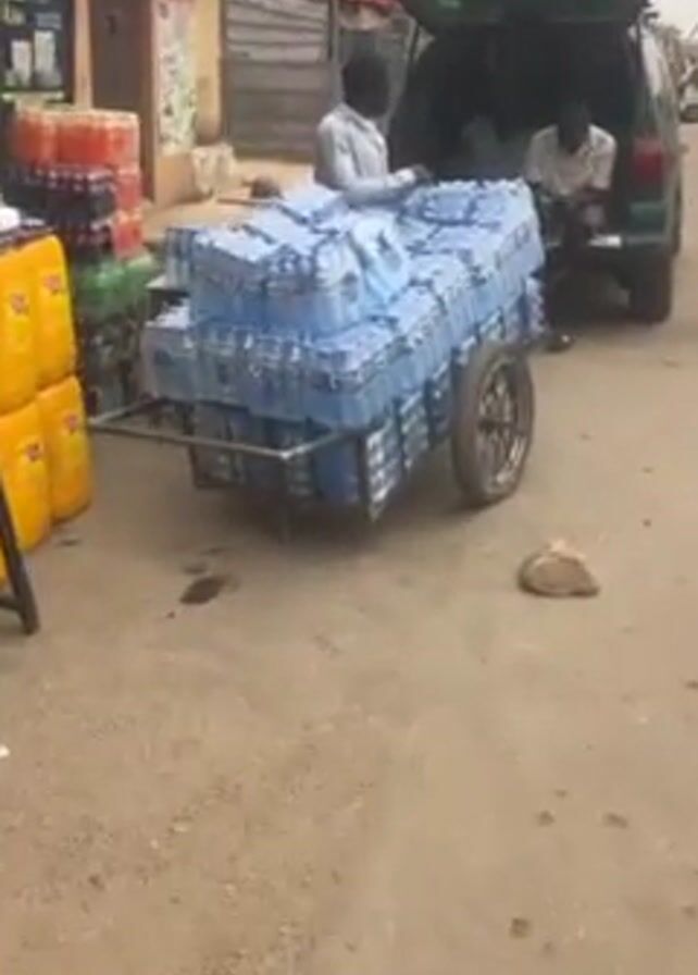 medium shot of a street scene. In the foreground, a two-wheeled metal cart is heavily loaded with many stacks of water bottles wrapped in blue plastic. Behind the cart, the open trunk of a dark-colored minivan is visible, with two men inside. One man is sitting while the other appears to be adjusting something. To the left of the cart, partially visible are stacks of yellow containers and more water bottles on display near a small building. Another man walks past the scene on the right side of the frame. The ground is dirt or pavement and shows signs of wear. Other buildings can be seen in the background.