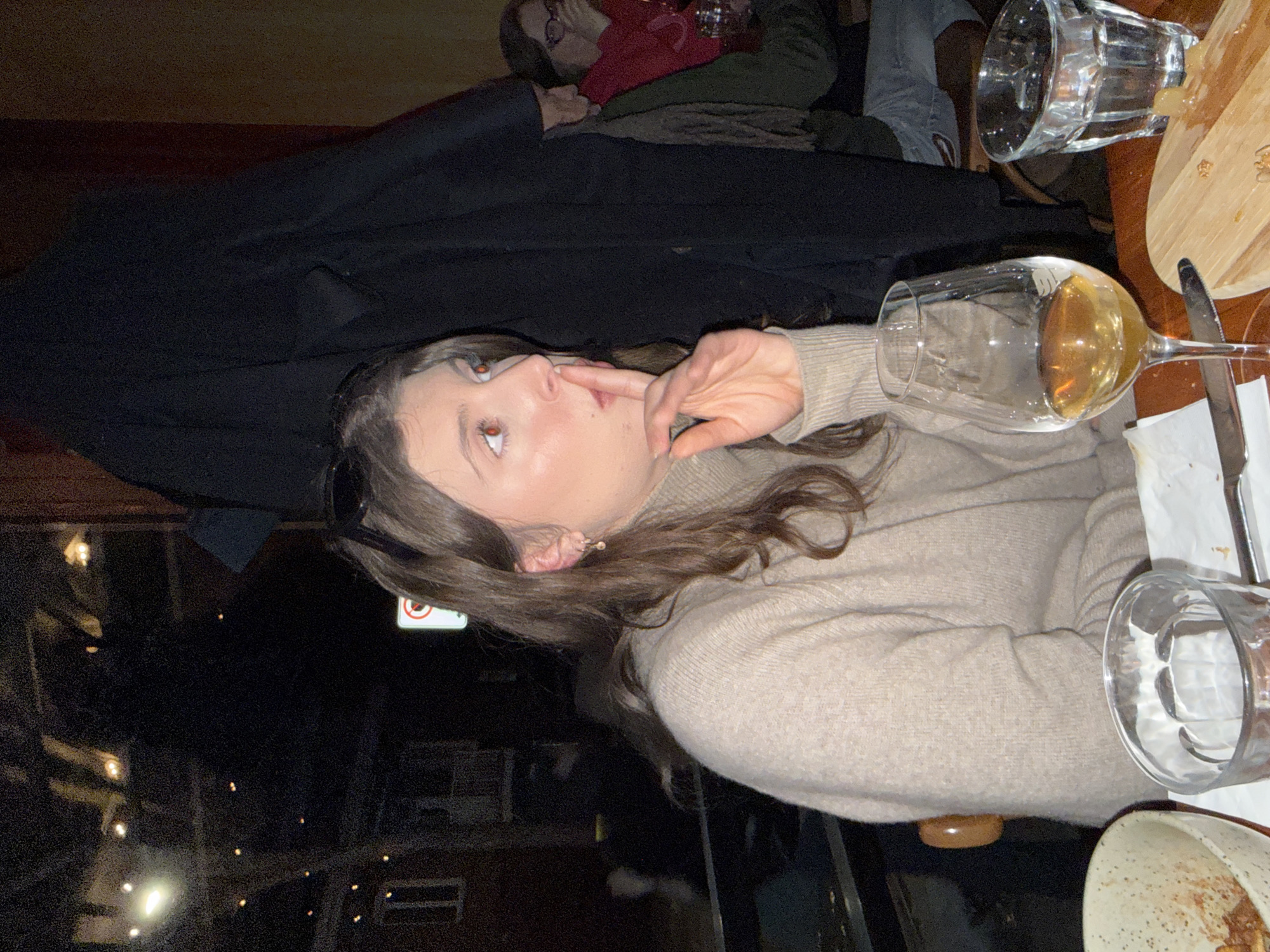 The image depicts an indoor dining scene at night in Montreal, Canada. A female subject, with long brown hair and wearing a beige turtleneck sweater, is seated at a wooden table. Sunglasses are perched on her head. She holds her right index finger to her lips, making a "shush" gesture, with a reddish flash reflection visible in her eyes. On the table in front of her are a wine glass containing white wine, an empty faceted water glass, a metal knife, a wooden serving board with scattered food remnants, a crumpled white napkin, and a partially visible ceramic bowl containing food debris. In the background, to the right of the main subject, a dark coat hangs against a dark wall. Another individual wearing glasses and a red top is partially visible further to the right, behind the hanging coat. Through a window or opening in the background, an outdoor street scene at night is visible, featuring distant lights from buildings and streetlights, along with a partially obscured red and white "No Parking" sign.