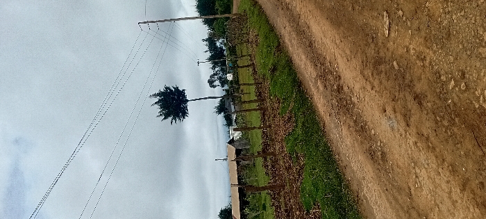 A landscape displays a dirt road beside a fence line. Utility poles and power lines stretch along the roadside. A tall tree stands prominently. Houses and buildings are scattered behind the fence. Overcast sky covers the scene.