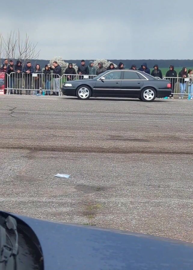 dark gray sedan, possibly an Audi, parked on an asphalt surface. A crowd of people, mostly wearing dark hooded jackets, stands behind a metal barrier watching. The background includes a field with green vegetation and a cloudy sky. A portion of a blue vehicle is visible in the foreground.