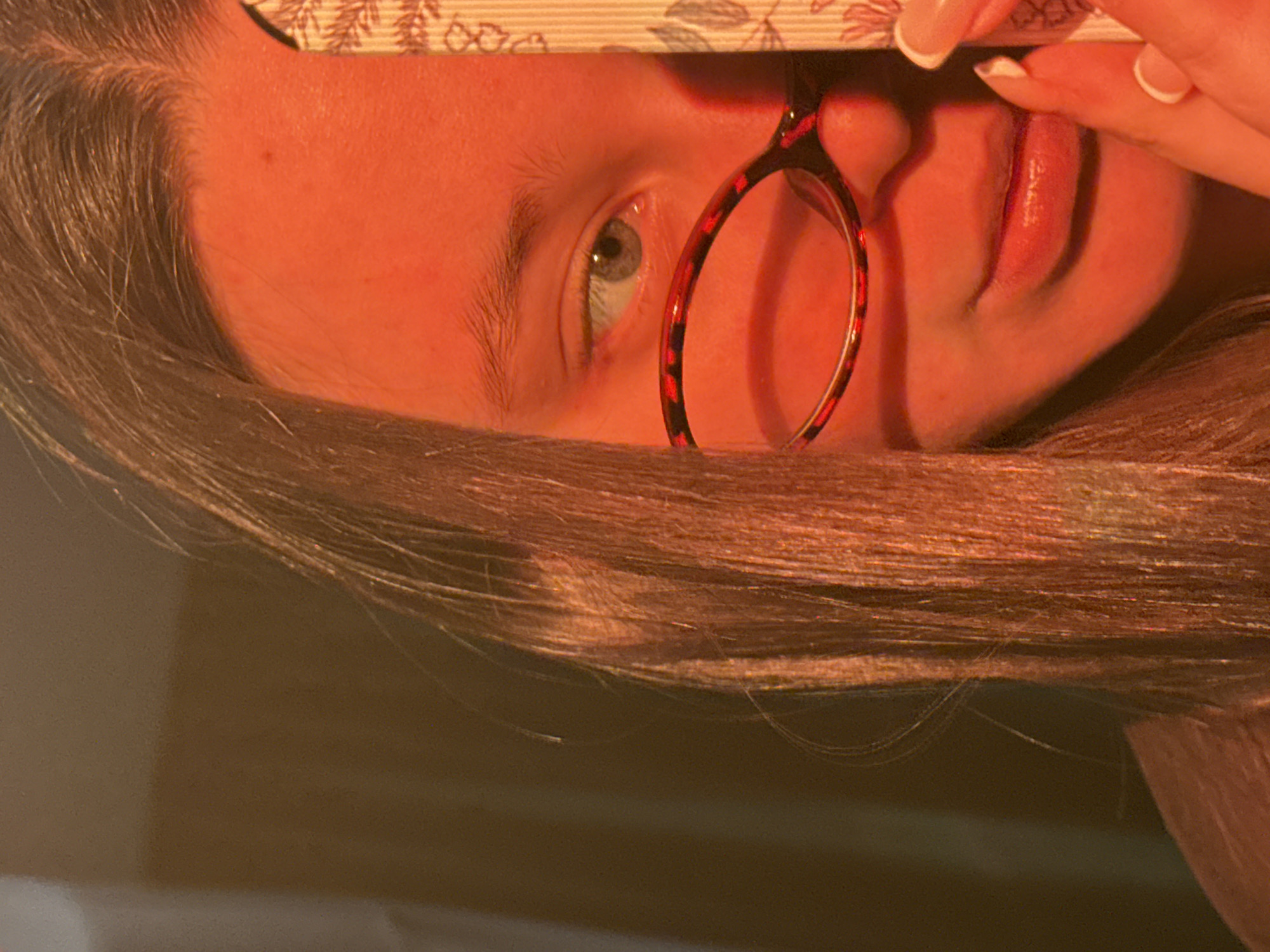 A close-up, slightly angled portrait of a person with light skin and light brown hair. The person is holding a patterned window blind, obscuring the upper portion of their face. Only one eye is visible, appearing to be gray-green. The person is wearing round, patterned glasses. Their lips are visible and appear to have lip gloss. A hand with manicured nails is holding the window blind. The overall color tone is warm and orange, likely due to lighting conditions. No location is identifiable in the image.