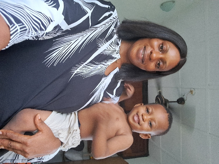 An adult female is depicted holding a young male child in an indoor domestic setting. The female, positioned on the left, has dark skin, dark, straight, medium-length hair, and wears a dark dress with a white feather-like pattern. She exhibits a faint smile while looking forward. The child, a toddler male with dark skin and short dark hair, is shirtless and wears light-colored shorts. He is held in front and to the right of the female, smiling broadly and looking directly at the camera. The female's right hand and forearm are visible, supporting the child. The background features a light-colored ceiling with visible panel lines, a dark ceiling fan with exposed wiring in the upper right, and a partially visible dark brown piece of furniture behind the child. A light blue, possibly translucent, wall fixture is visible on the upper left wall.