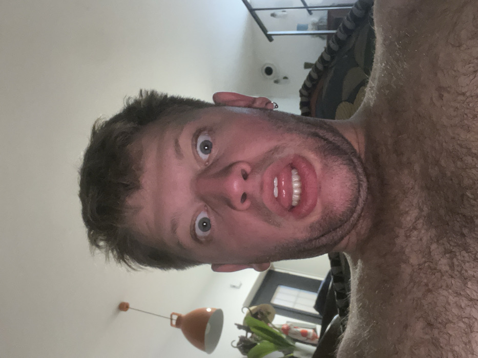The image captures a close-up, chest-up view of an adult male in an indoor residential setting. The male subject has light skin, short brown hair, and visible chest and shoulder hair. He is shirtless. His eyes are wide open, pupils centered, and he directly faces the camera. His mouth is open, with the tongue partially visible, exposing both upper and lower teeth. His facial expression suggests exaggerated surprise or comical shock, with raised eyebrows. A silver hoop earring is present in his left earlobe. The background, predominantly light-colored walls and ceiling, shows an orange pendant light fixture hanging from the ceiling in the upper left. Below the light fixture, a dark door frame or cabinet is visible, along with a potted plant. To the right, a dark, possibly metallic, railing or partition is partially visible, along with a patterned textile on what appears to be furniture. The specific location within Modiin-Maccabim-Reut, Israel, is not discernible from the visual elements within the image.