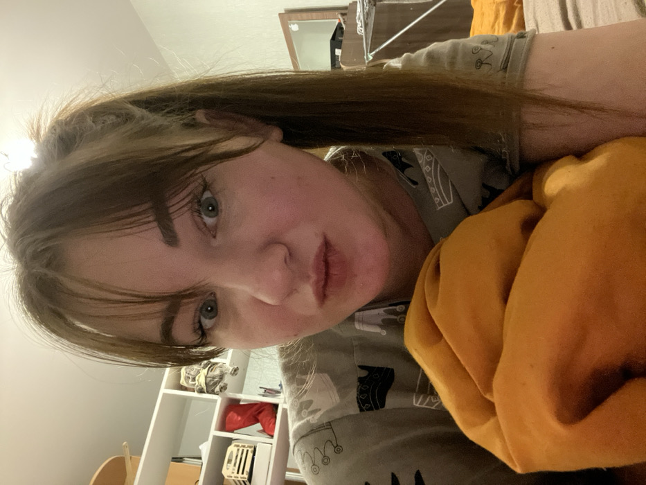 A young woman with auburn hair and bangs looks at the camera. She has fair skin, green eyes, and full lips. She is lying down, with a mustard-yellow cloth draped over her. She wears a gray pajama top with black and white animal prints. Behind her is a white bookshelf with various items. The image is slightly tilted.