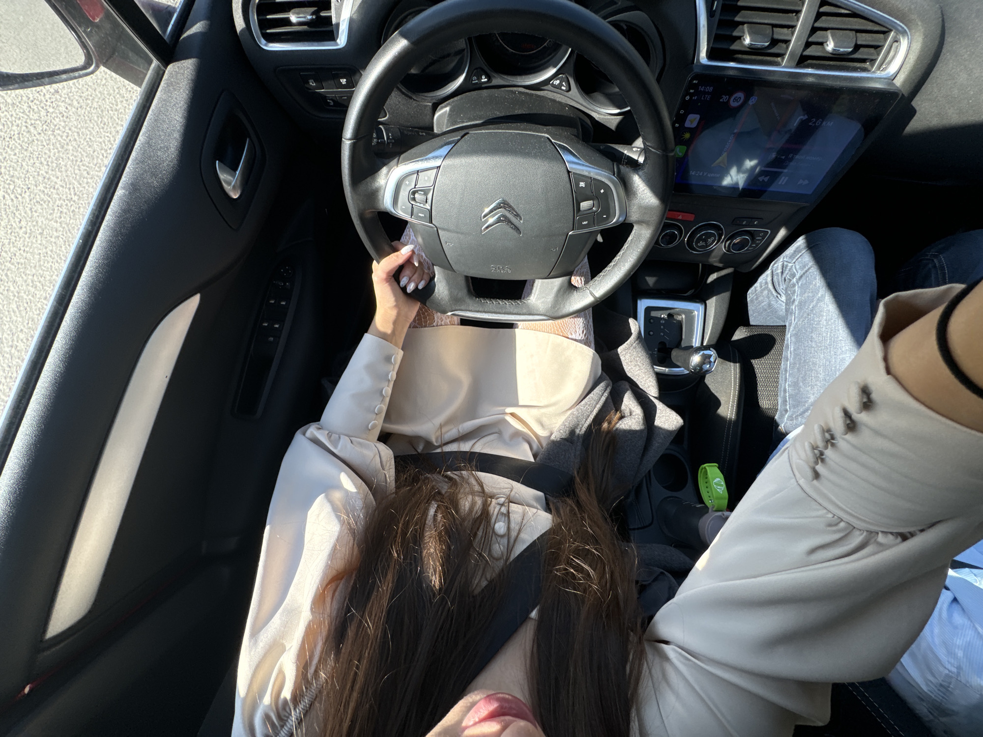 A view from inside a Citroen car, looking down at a woman in the driver's seat