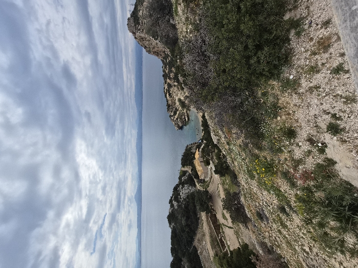 The image presents an elevated view of a coastal landscape within the Municipal Unit of Loutraki - Perachora, Greece, under an overcast sky. The foreground features a steep, arid hillside composed of light-colored rock and soil, sparsely covered with scrub brush, small green plants, and scattered yellow and white wildflowers. A grey horizontal structure is partially visible at the bottom right. In the midground, a small, tranquil bay with light blue-green water and a narrow beach is visible. A light-colored building with a reddish-brown tiled roof stands near the shoreline of the bay, accessed by a winding dirt path. To the left of the bay, an archaeological area is discernible, characterized by excavated terracing and visible stone foundations, bordered by dense green vegetation. A prominent rocky headland extends into the water on the right side of the bay. The background consists of a vast expanse of calm water, likely the sea or a gulf, extending to distant, hazy mountain ranges and landmasses beneath a sky heavily laden with grey and white clouds. No people or active subjects are present in the scene.