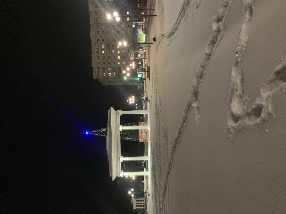 A winter scene at night. Snow-covered ground with footprints leads toward a white colonnaded structure and a brightly lit Christmas tree topped with a blue star. In the background, an apartment building is lit with many windows. Streetlights illuminate the scene. The sky is dark.