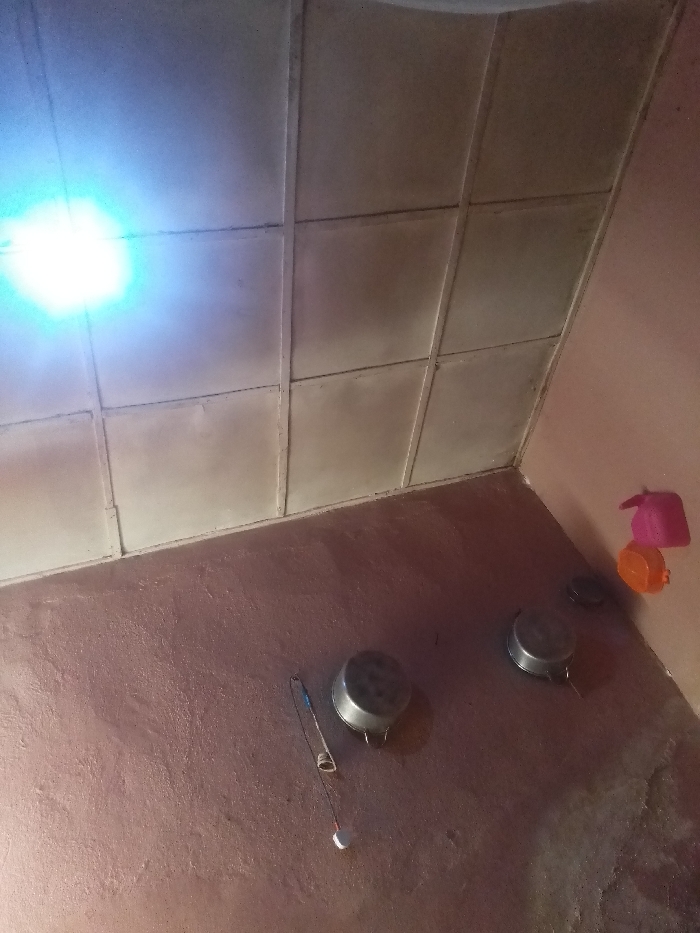 The image depicts an interior room in Unknown, Unknown. The floor is a textured, reddish-brown surface. The right wall is a plain, light reddish-brown. The ceiling is composed of light-colored rectangular panels arranged in a grid pattern. A bright, blue-white light source is visible in the upper-left corner, casting a luminous glow. On the floor, from left to right, lies a slender object with a white tip and blue section. Adjacent to it are two inverted silver-colored metal pots or bowls of varying sizes, and a small, dark circular object. Two plastic items, one pink and one orange, are affixed to the right wall. No individuals are present in the scene.