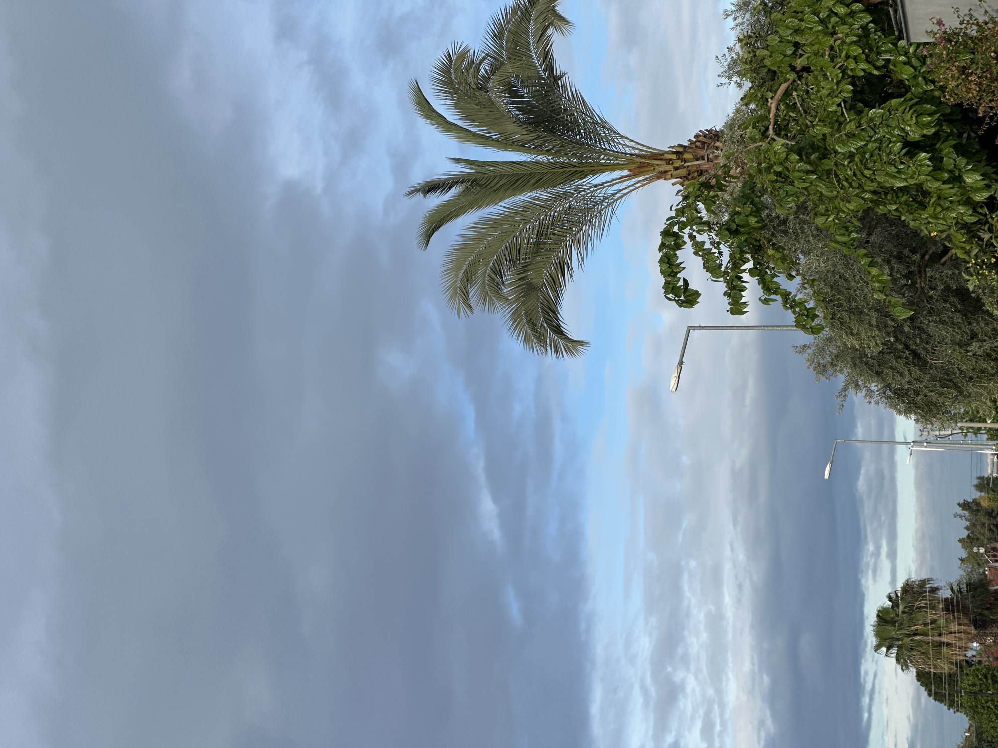 The image displays an outdoor scene in Fethiye, Turkey, under a partially overcast sky. The upper two-thirds of the frame are dominated by a sky featuring a mix of grey and blue clouds, with lighter blue patches interspersed. A large, prominent palm tree with green fronds is situated in the upper right-center. Below and to the left of this palm tree, a dense accumulation of green foliage, consisting of various trees and bushes with both large bright green leaves and smaller grey-green leaves, occupies the lower right and central-lower portion. Two streetlights with grey metallic poles and horizontal rectangular luminaires are visible; one stands prominently to the left of the large palm tree, and a second, smaller one is partially obscured in the distant left-center. In the far lower left, another palm tree, along with distant vegetation and faint structural outlines, indicates a built environment. No individuals or specific actions are depicted within the frame.