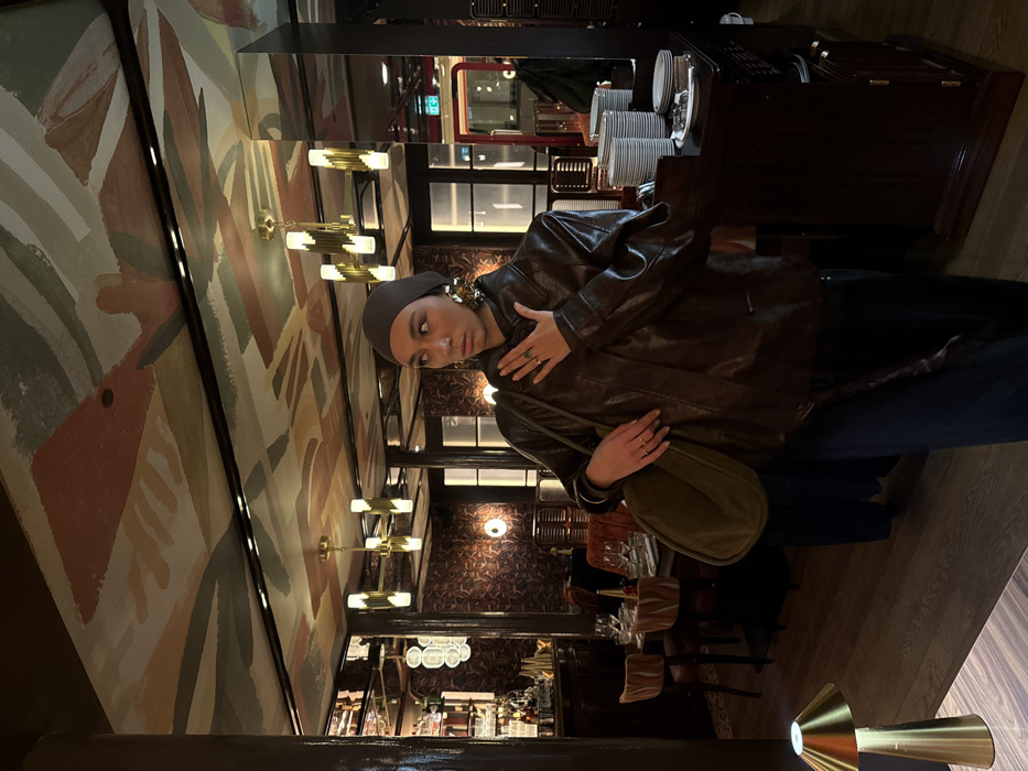 A woman wearing a brown head covering and jacket with large gold earrings stands inside a restaurant. She is holding a green bag on her shoulder. The background features a wall with abstract designs, lighting fixtures, and a counter with plates. Tables and chairs are visible in the background, suggesting a dining area. The overall ambiance is dimly lit and stylish.