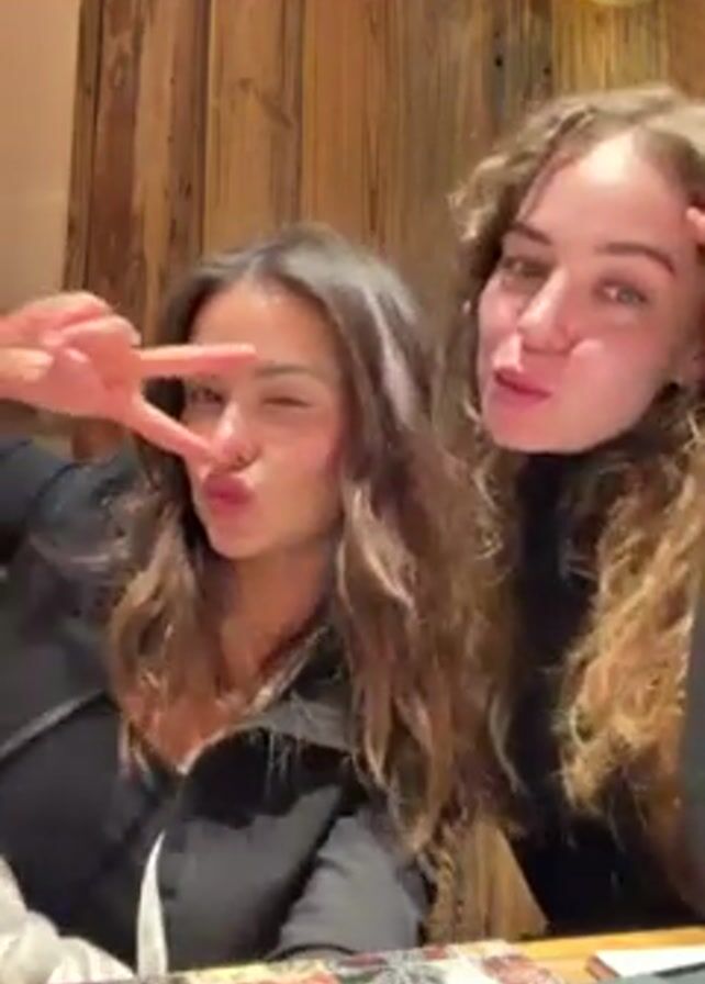 Two young women are seated at a table, posing for a selfie. The woman on the left has long brown hair and wears a black top and jacket. She makes a peace sign with her fingers and puckers her lips. The woman on the right has curly brown hair and wears a black turtleneck. She poses with her hand near her face, also puckering her lips. The woman on the left then playfully puts her hands on the other woman's face. A Canon camera is visible on the table in front of them. The background features a wooden wall and a light fixture. Restaurant noises can be heard.