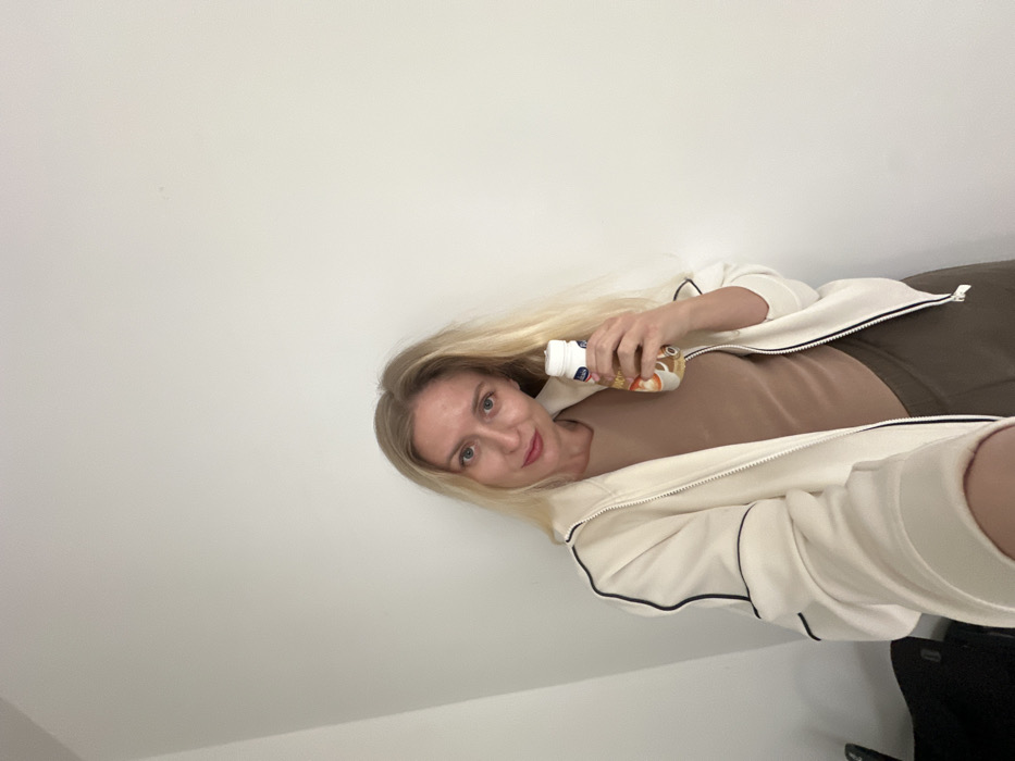 An adult female, appearing to be in her 30s or 40s with long, disheveled light blonde hair and a fair complexion, is depicted in an indoor setting against a plain white wall in Petah Tikva, Israel. She is looking directly at the camera with a slight smile. Her attire consists of a light-colored, possibly off-white or cream, zippered jacket with dark trim lines on the sleeves, worn over a plain tan t-shirt. Partially visible lower clothing appears to be olive-green. She holds a small white plastic bottle with a blue and white label, featuring Hebrew text including "תנובה" (Tnuva) and "מעדן" (Ma'adan), and an image of a caramel or coffee-flavored drink, in her right hand. Her left arm extends forward, suggesting she is taking a self-portrait. A subtle wall corner is visible on the far left of the frame.