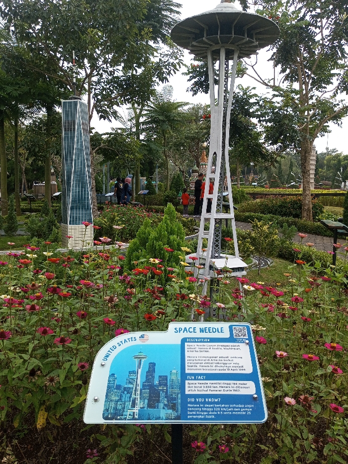 The image depicts an outdoor miniature park scene located in Tân Kỳ Commune, Vietnam. In the foreground, a dense bed of colorful zinnia-like flowers in shades of red, pink, orange, and white occupies the lower half of the frame. An informational sign, predominantly blue and white, is partially embedded within these flowers on the right; it is titled "SPACE NEEDLE" and features an illustration of the Seattle skyline. Immediately behind the sign and flowers, a white miniature replica of the Space Needle stands vertically. To the left of the Space Needle model, a tall, slender miniature skyscraper model with a blue and white patterned facade is visible. Several individuals are present among the exhibits. An adult dressed in dark clothing and a child wearing a red shirt stand near the base of the Space Needle model. Further to the left, a group of approximately three to five adults, primarily in dark attire, is gathered near other miniature structures. The background consists of a landscaped park environment with manicured lawns, various green shrubs, and numerous tall trees providing a canopy. A paved pathway is visible winding through the exhibits. The lighting is diffused, consistent with an overcast sky.