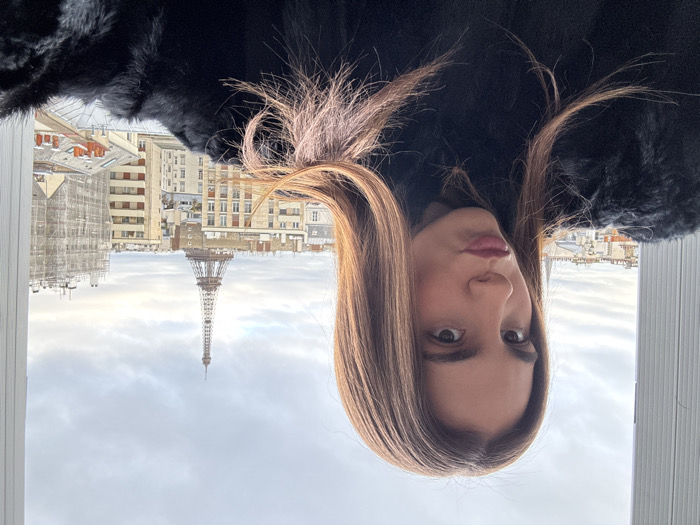 A young woman with light brown hair, wearing a dark, possibly faux fur, jacket, poses for a selfie indoors, looking directly at the camera with pursed lips. The background, viewed through a window, displays a panoramic urban cityscape of Paris, France. The Eiffel Tower is prominently visible in the mid-distance, positioned to the right of the woman's head. Numerous light-colored Parisian buildings with varied architecture span the horizon. A large building on the far right is partially obscured by scaffolding. The sky is overcast with gray clouds, with a slightly brighter area near the horizon, indicating a cloudy day. The viewpoint is elevated, suggesting an upper floor of a building.