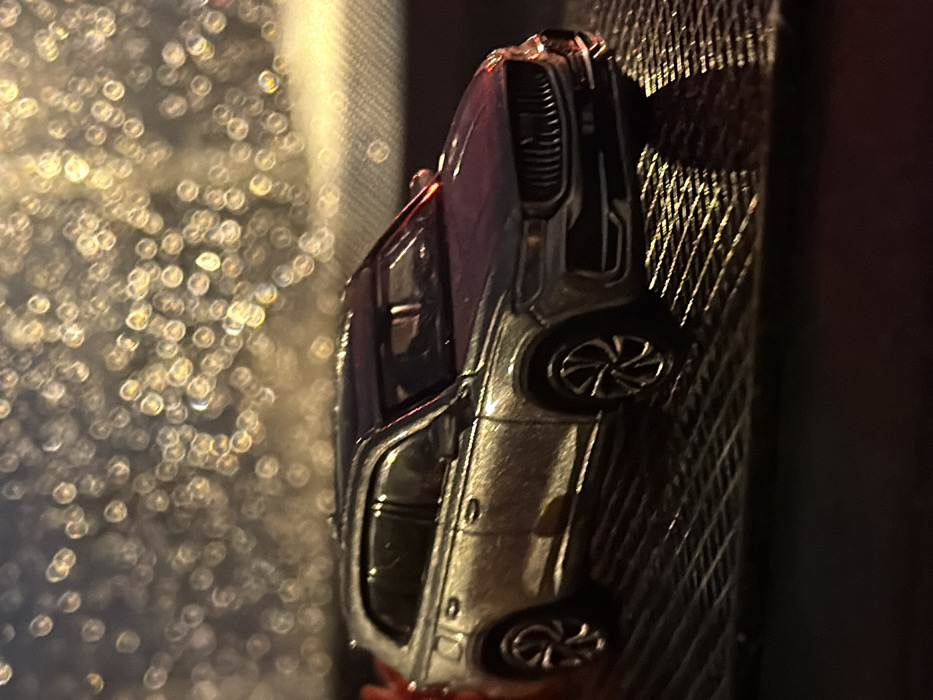 A metallic grey miniature SUV model, approximately 1:64 scale, is depicted in a low-light, close-up photograph