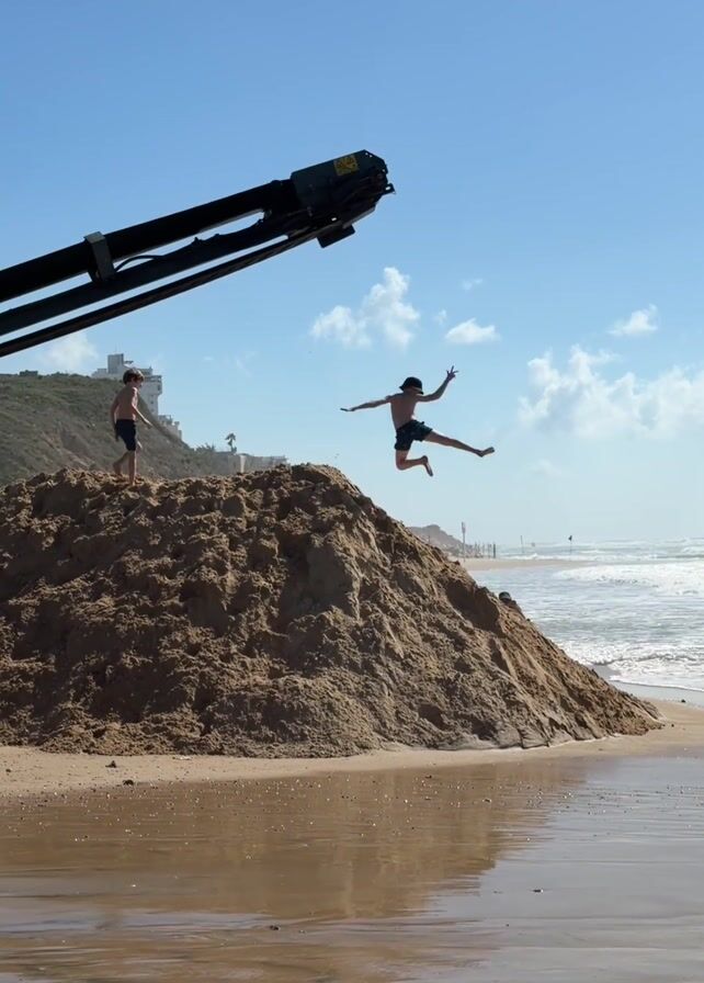 Two boys are on a large sand dune next to the ocean on a sunny day with some clouds. One boy jumps down the dune, landing on the beach below. The other boy remains at the top. An industrial crane arm looms over the scene. The ocean is visible in the background.