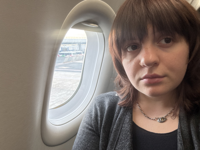 A female individual is depicted in a medium close-up photograph taken inside an aircraft cabin at Fiumicino Airport, Fiumicino, Italy