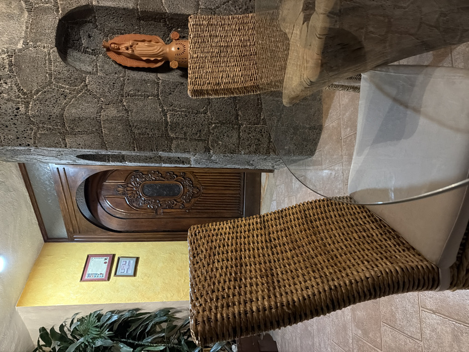 This image depicts an interior space, likely a dining or common area, within a residence or establishment in Cuernavaca, Mexico. The foreground features a wicker chair with a light-colored cushion, seen from the back, partially obscured by a clear, round glass table. The table's base, visible through the glass, is made of rough, carved light-colored wood. To the right, another wicker chair with a similar cushion faces away from the viewer. Behind this chair is a thick wall constructed of dark grey, textured volcanic stone blocks, featuring an arched alcove. Within this alcove, a terracotta-colored statuette of the Virgin of Guadalupe stands on a decorative base, with her hands clasped in prayer and surrounded by rays. The background on the left reveals a textured yellow wall with two framed items hanging vertically; the upper frame is red, the lower is brown/gold. A large green potted plant, possibly a palm, is situated in the far left corner. A warm light emanates from a ceiling fixture. Directly behind the glass table and between the stone wall and the yellow wall, a tall, arched wooden door with intricate carvings, including a central oval glass panel, stands closed. Above the wooden door, a rectangular transom window with frosted or obscure glass is visible. The floor throughout the visible area is composed of light brown or beige square tiles. No individuals are present in the scene.
