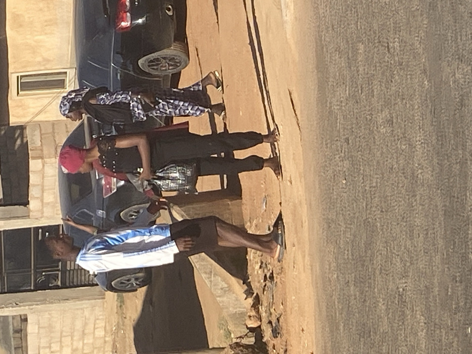 The image depicts an outdoor street scene in Kirana, Nigeria, under direct daylight. Three individuals are visible on a dirt and gravel shoulder adjacent to a paved road, with architectural structures and two dark sedan vehicles in the background. On the left, a male, dark-complexioned individual stands facing right. He wears a long-sleeved white and light blue striped shirt, dark shorts, and dark slide sandals. His right hand is raised with the index finger extended. In the center, a female, dark-complexioned individual stands facing left, appearing to interact with the male. She wears a red headwrap, a black short-sleeved top with dark lace detailing on the shoulders, black trousers, and light-colored flat sandals. She holds a grey and white patterned bag in her left hand. To the right, a second female, dark-complexioned individual is in motion, walking from right to left, partially behind the central female. She wears a patterned blue, white, and black long garment, a dark shawl over her shoulders, a matching patterned head covering, and light-colored flat sandals. Behind the individuals, two dark-colored sedan cars are parked or stationary on the paved surface. The background further includes a light-colored building with a window on the right and an unpainted, possibly unfinished, building with visible brickwork on the left. Distinct shadows are cast on the ground, indicating strong sunlight.