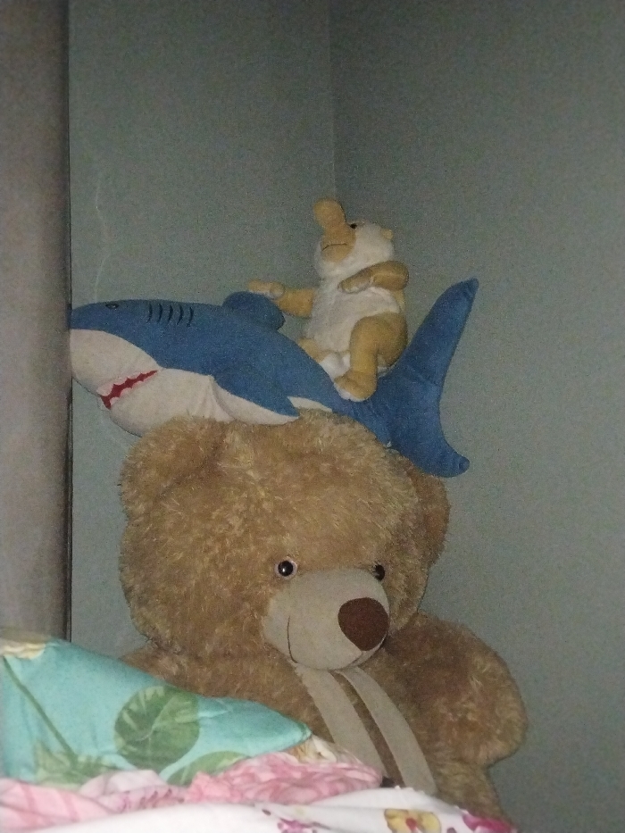 The scene is located in the city of Pie, Indonesia. The image displays an interior setting, likely a room corner, featuring three stacked plush toys against a light blue-green wall. A large, light brown teddy bear with dark, round eyes and a brown snout is seated centrally, facing the viewer. Resting on the teddy bear's head and upper back is a blue and white plush shark, oriented with its head to the left, detailing red stitched gills and an open mouth with white teeth. A smaller, light brown plush creature, characterized by an elongated snout and outstretched arms, is perched atop the shark's back, facing towards the right. A vertical grey structural element is partially visible on the far left edge of the image. The foreground shows patterned bedding, including a light blue pillow with green leaf designs and white fabric with pink floral patterns. No human subjects are present.