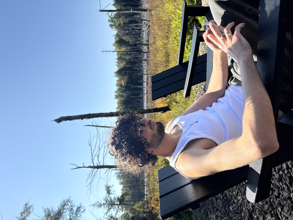 A young adult male is seated in a dark Adirondack-style chair in an outdoor setting within Otego, United States