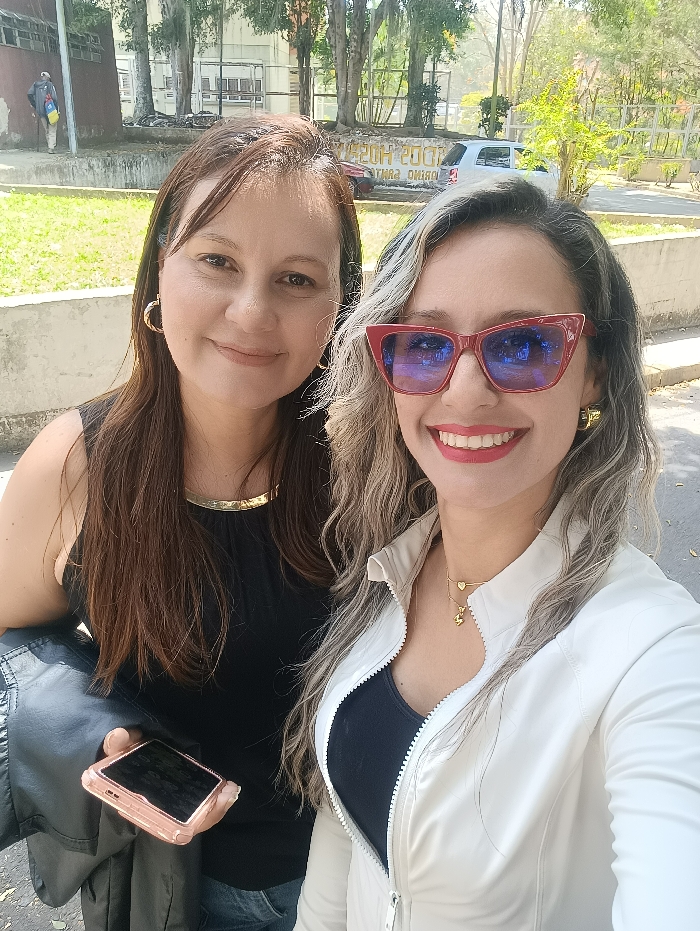 Two adult females are positioned closely for a photograph in an outdoor, daytime setting in Los Teques, Venezuela, near the Hospital Dr