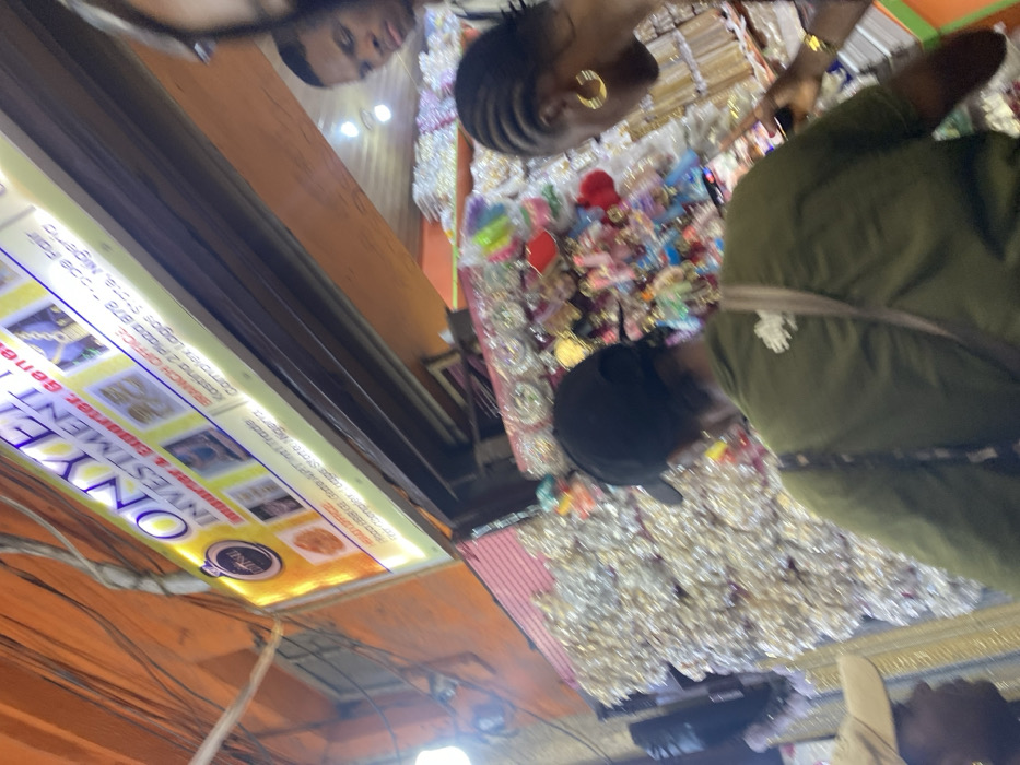 The image depicts an indoor market scene in Satellite Town, Nigeria, characterized by dense merchandise displays and multiple individuals. A prominent, illuminated sign for "ONYEE INVESTMENT IMPORTER & EXPORTER. GENERAL MERCHANT" hangs overhead, displaying images of goods and listing head and branch offices in Lagos State, Nigeria. The wall behind the sign is orange. In the foreground, a person is viewed from behind, wearing a dark green top and a black baseball cap, with a light brown bag strap visible over their shoulder, looking at the merchandise. To their right, a person with braided hair and a gold hoop earring is visible in profile, holding a phone or small device, also observing the displayed items. Further right, partially visible, a male individual with short dark hair looks towards the left. On the far left, another person's profile, wearing a tan cap, is partially visible. The environment is a retail space densely packed with small consumer goods. On the left, a large quantity of small, shiny items, individually wrapped in clear plastic, forms a wall-like display. The central and right areas are filled with various colorful accessories, including what appear to be hair scrunchies, decorative pins, keychains, and other small items, many in metallic or bright hues, arranged on racks and shelves. The individuals are engaged in the action of browsing the merchandise. Artificial lighting illuminates the scene.